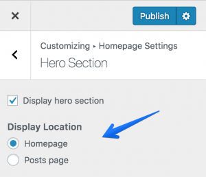 If you however select a static page for your homepage in Appearance → Customise → Homepage Settings → Static Front Page, the option Display Location will appear in the Hero Section and Featured Posts: