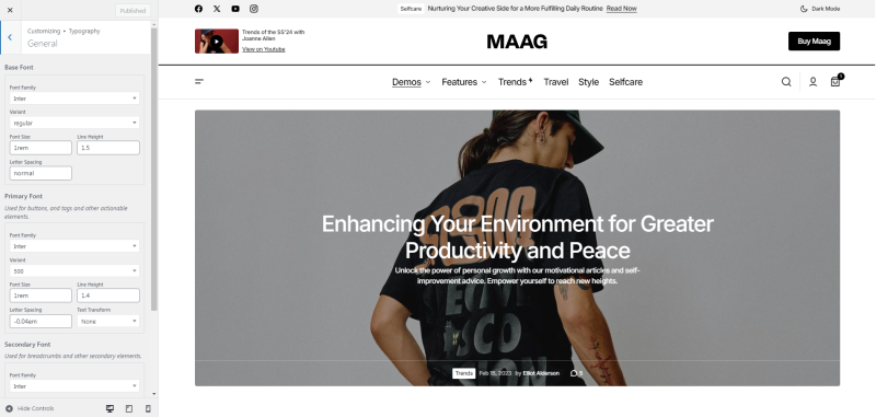 You can usually change the font family, size, weight, style, and color of various elements such as headings, paragraphs, links, etc. Take advantage of these options to create a visually appealing and cohesive typography style that matches your brand by going to AppearanceCustomiseTypography.