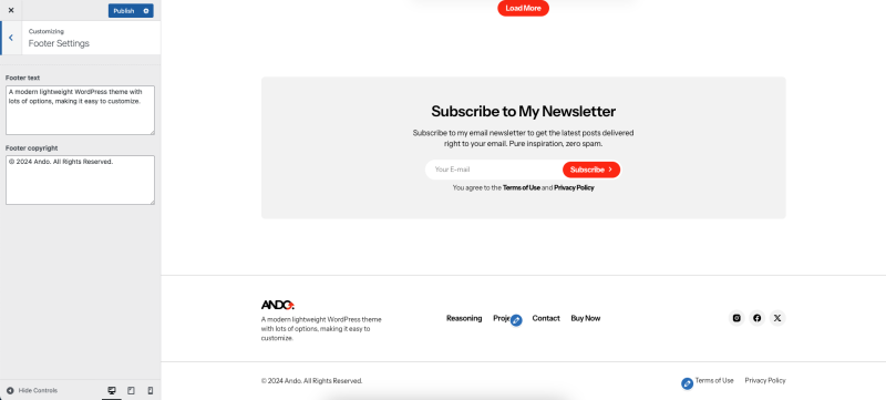 Footer settings are located in Appearance → Customize → Footer Settings.