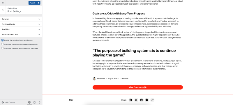 The auto load next post automatically loads the next post when a user reaches the end of the current article without reloading the page. This enhances the user experience by providing seamless content browsing and increases engagement, as users can read more content without needing to click through to new pages.