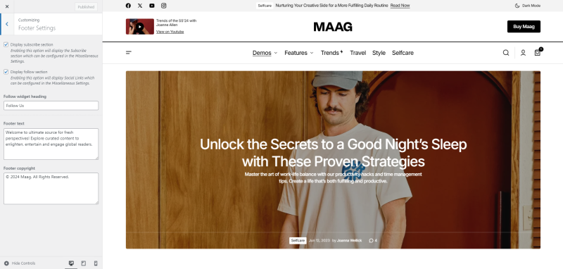Footer settings are located in Appearance → Customize → Footer Settings.