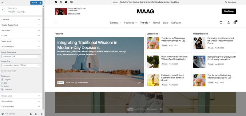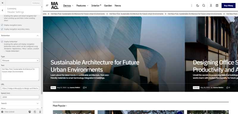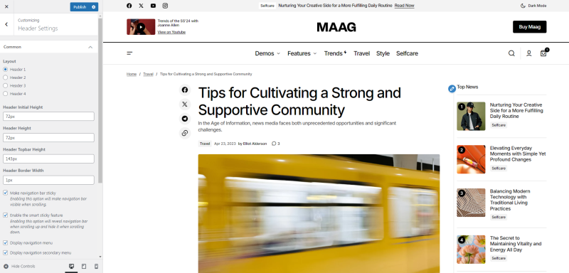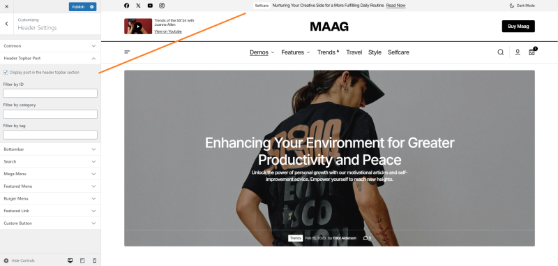 The feature allows you to display a post in the header of your website. It can be used to highlight important announcements, promotions, or featured content, making it easily visible to visitors. This is a great way to draw attention to key information right at the top of your site. Available is only in layout Header 1 and Header 2.