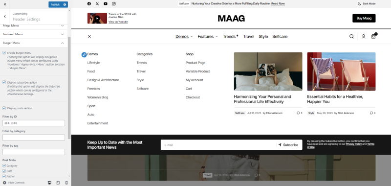 The burger menu includes the ability to display featured posts and a subscription form. This feature allows you to showcase important content and encourage user engagement directly from the menu, providing a streamlined way for visitors to discover key posts and subscribe to updates.