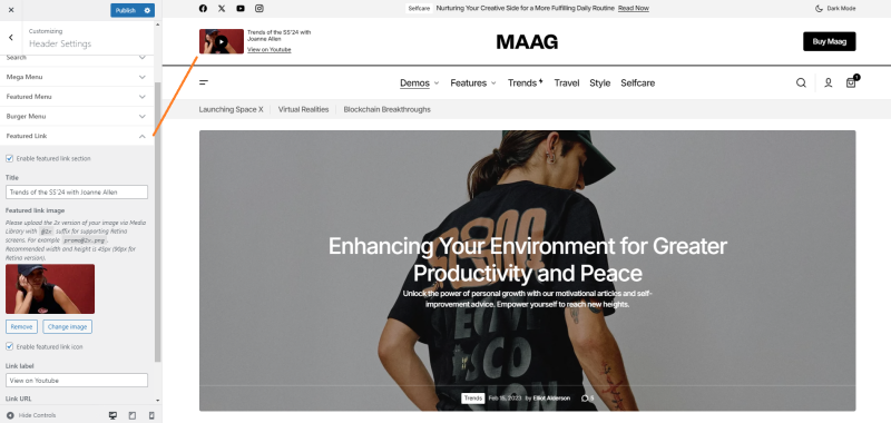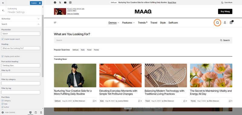 The search functionality in the header allows you to configure the display of featured posts within the search panel. This enhancement makes it easier for users to find and access highlighted content directly from the search interface, providing a more curated and engaging experience.