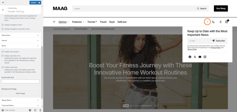 Allows you displays a block with a subscription form and social media links, providing a convenient way for visitors to stay connected and follow your updates. This integrated approach enhances user engagement by streamlining access to your newsletter and social media platforms directly from the header. Available in layout Header 3 and Header 4.