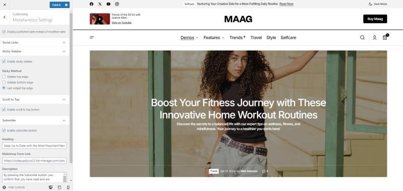 There’re a few miscellaneous settings in Appearance → Customise → Miscellaneous Settings.