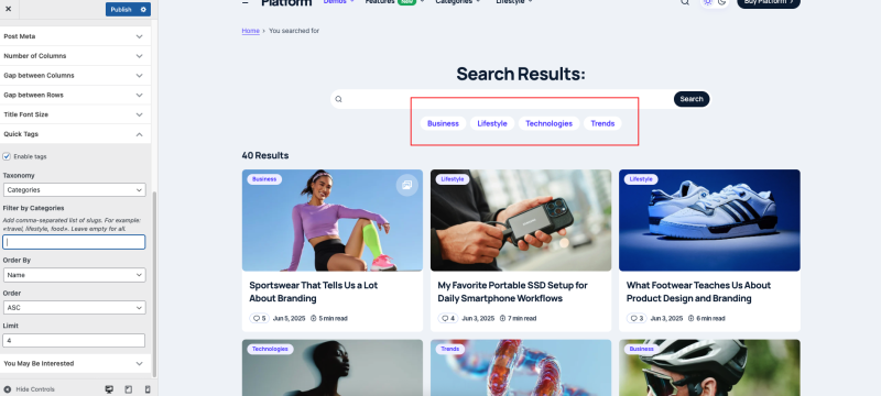 This option adds a row of quick-access tags below the search form, allowing visitors to explore popular categories or tags with a single click.