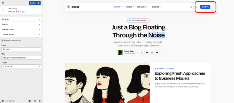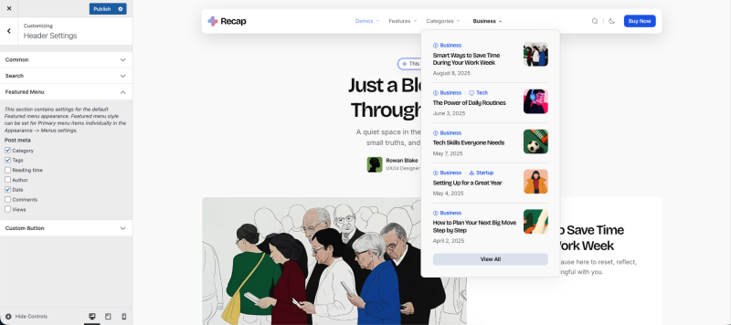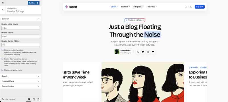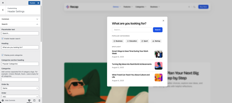 The theme offers header search customization settings to enhance user experience.